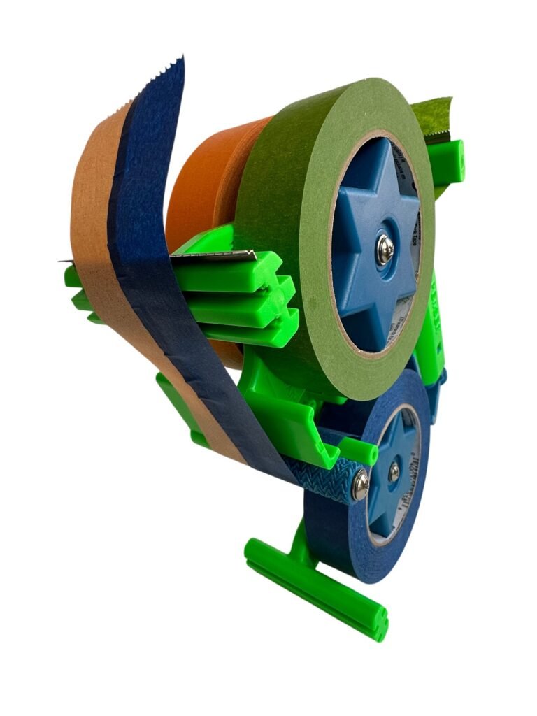 Compatibilidad versátil de cintas: Admite anchos de cinta que van desde 1/4″ hasta 1-1/2″. Funciona con todas las cintas de enmascarar sensibles a la presión, independientemente de su fuerza de adhesión, así como con cualquier marca de cinta que posea un núcleo central de 3 pulgadas. La carga de los rollos de cinta es sencilla, manteniendo su forma circular sin sufrir deformaciones. Una vez cargados, los rollos de cinta no se deslizarán fuera de las ruedas a menos que se empujen deliberadamente para retirarlos.